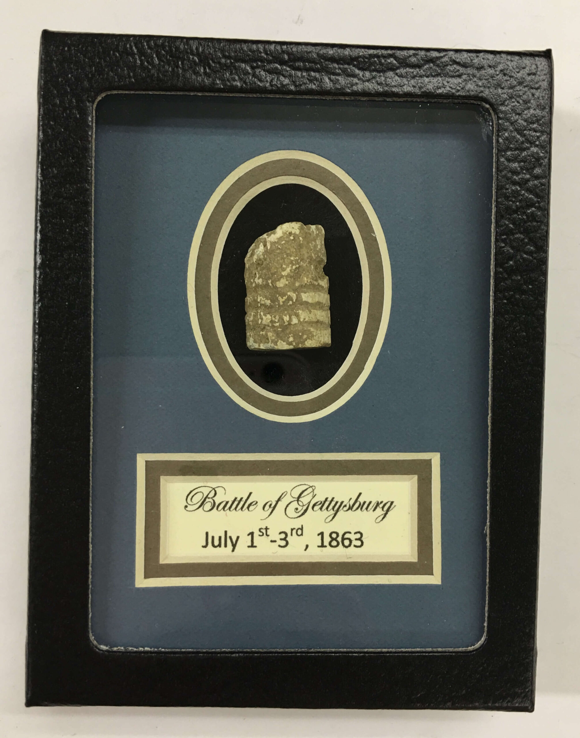 A unique 3×4″ relic box with 1 Civil War dug bullet padded and framed with a matte board featuring the Gettysburg battle dates. We buy our bullets from diggers in Virginia where fighting took place for many years during the Civil War. Unfortunately, it is now illegal to take relics from the battlefield in Gettysburg. Matte board and felt colors may vary. Bullets vary and will include dropped, fired or musket balls.