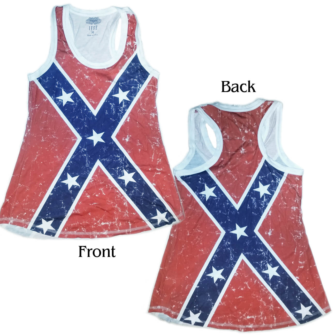 This gorgeous full-color front and black sublimated ladies racerback tank top features the Confederate flag.