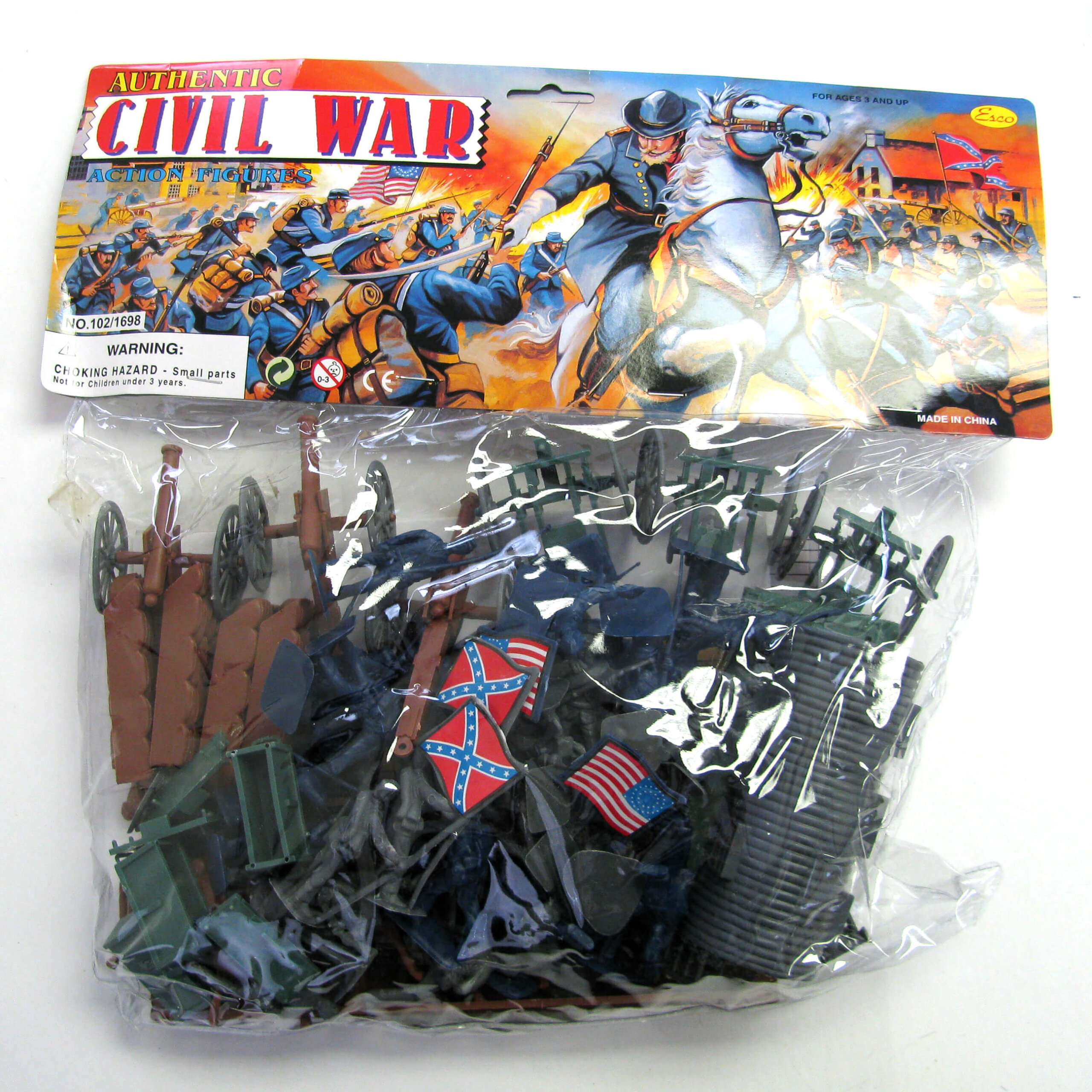 Union & Confederate set includes plastic soldiers, horses, flags and cannons.